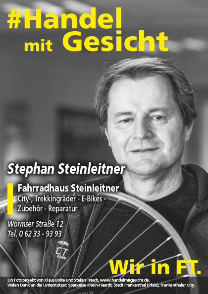 Schon als kleiner Junge war Stephan Steinleitner ein begeisterter Schrauber. Er hat bereits damals seine Räder immer selbst in Schuss gebracht. Seine Leidenschaft zum Radfahren gab den Ausschlag für den ausgebildeten Mechaniker, sich mit einem Radladen selbstständig zu machen. Seit rund 27 Jahren führt er nun sein eigenes Geschäft, in Frankenthal an den Standorten Schnurgasse, August-Bebel-Straße und nun in der Wormser Straße. Steinleitner war nach eigener Aussage einer der ersten, der auf den heutigen Trend E-Bikes setzte. Inzwischen sind E-Bikes zu seiner Leidenschaft geworden.